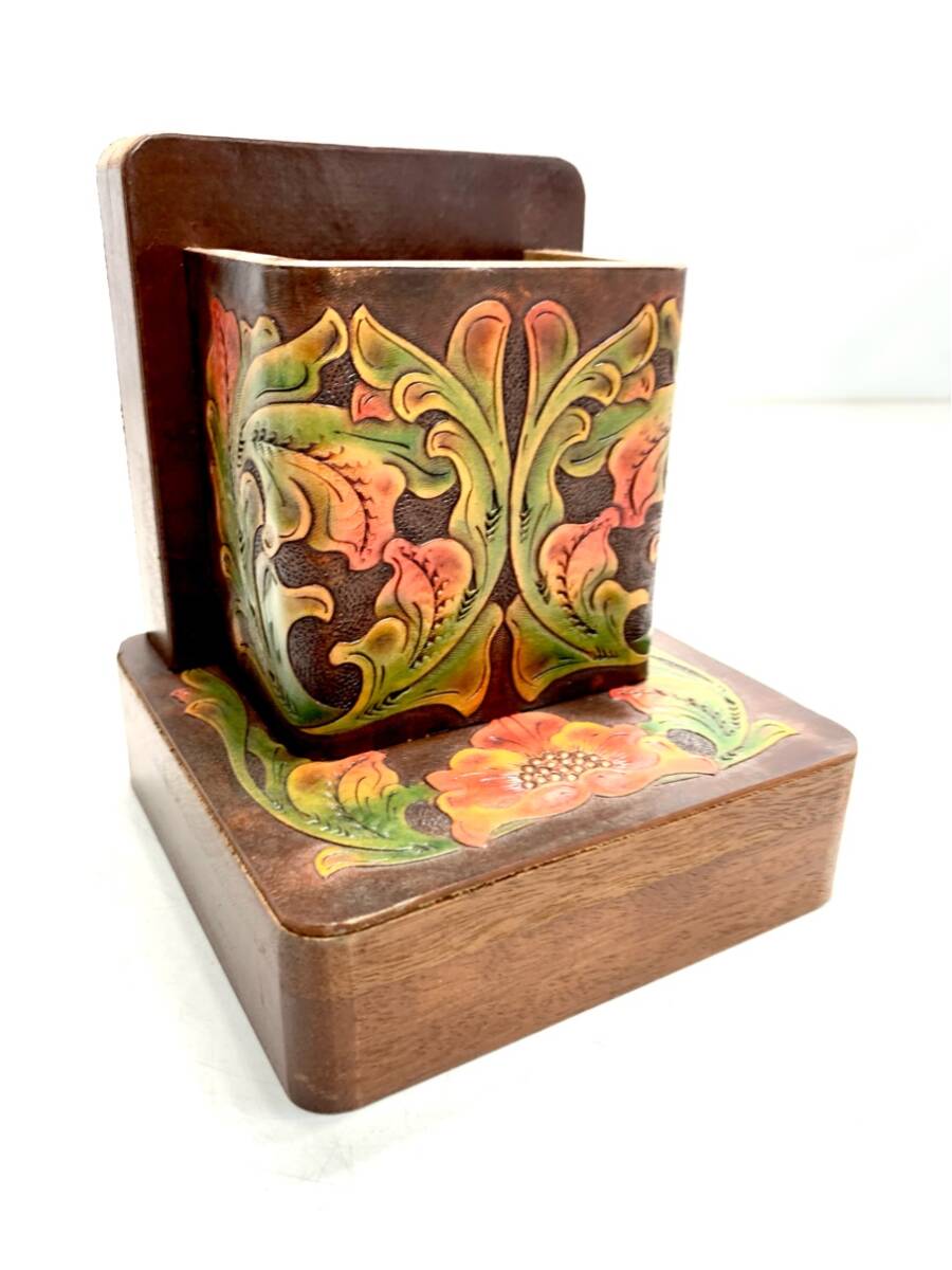 - 希少 アンティークリモコンホルダー ペンホルダー 小物入れ 木製 ウッド 花柄 昭和レトロ ヴィンテージ 7872 06