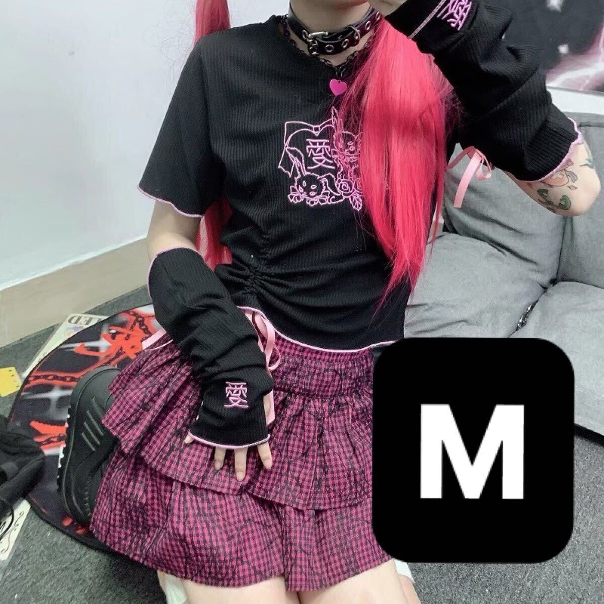 - Tシャツ ロングTシャツ トップス ロンT アームカバー トレンド ストリート レディース オルチャン 人気 ラビット うさぎ ブラック 黒 M