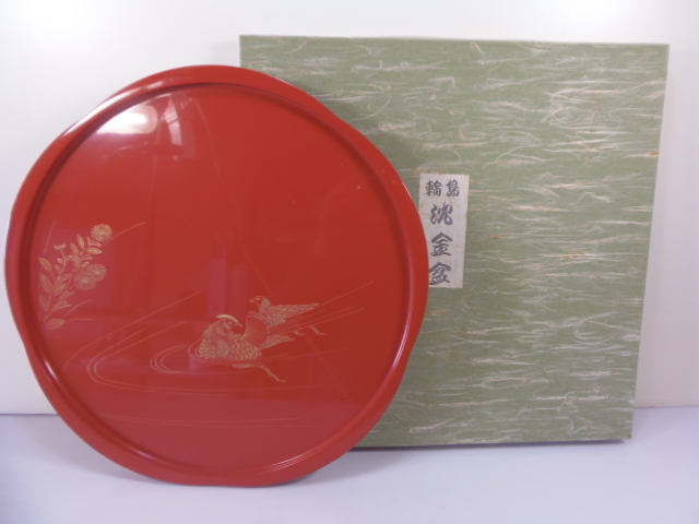 - sk162 【輪島塗】 盆 沈金 洗朱 梅形 花鳥文様