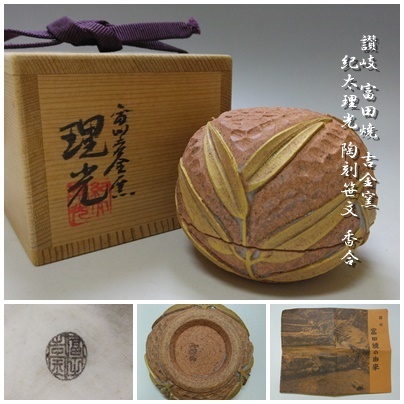 - 【T-288】讃岐 富田焼 吉金窯 紀太理光 陶刻 笹文 香合 共箱付