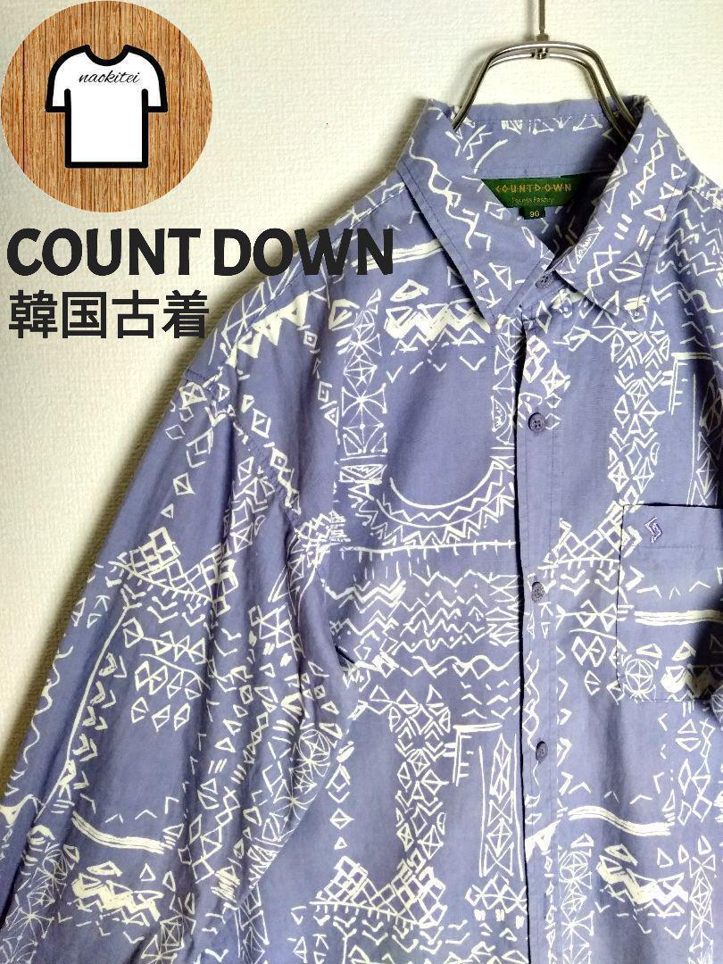 - COUNT DOWN 長袖シャツ M 総柄 幾何学模様 古代文字 民族柄 刺繍ロゴ 韓国製 A10