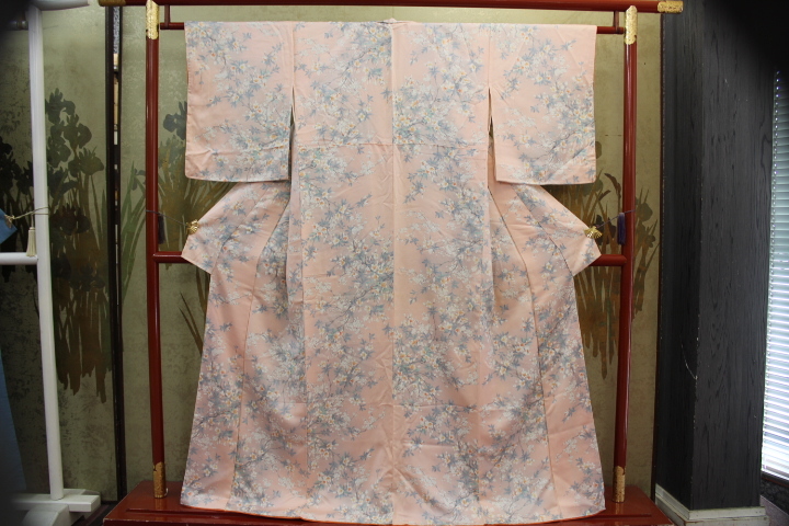 > きもの今昔7664 小紋のきもの 広衿袷手縫い仕立 正絹梨地綸子地淡いローズ色地 梅などの花木柄 身丈156cm