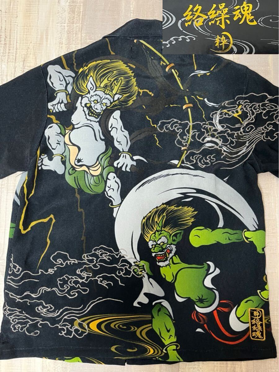 > 【新品タグ付 完売品 総柄 袖刺繍】絡繰魂 粋 和柄 アロハシャツ 半袖 メンズ 風神 雷神 オープン 昇華転写 Tシャツ 黒 ブラック M 和風
