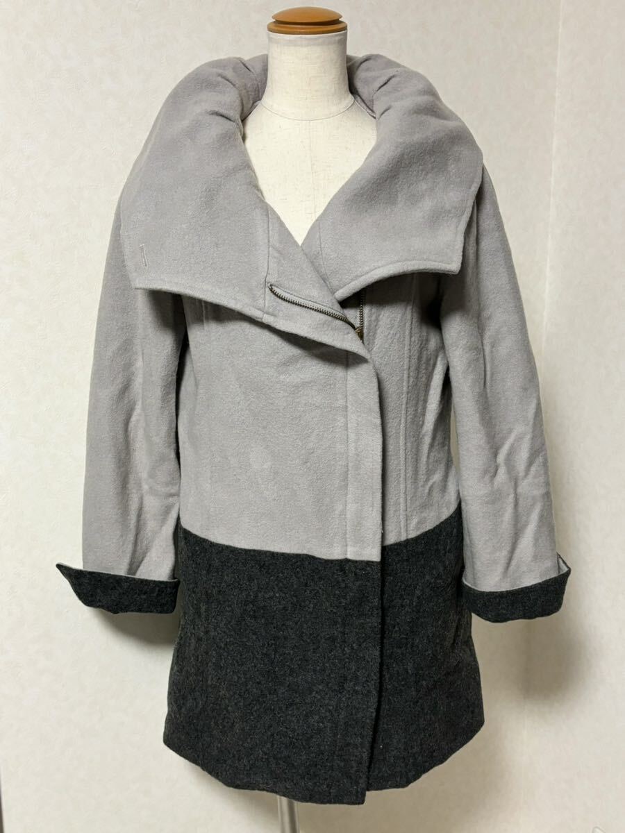 > ■ un-sept 毛90% レディース ハーフコート ウールコート ジャケット アウター 38号 Mサイズ 9号 グレー バイカラー セミロングコート