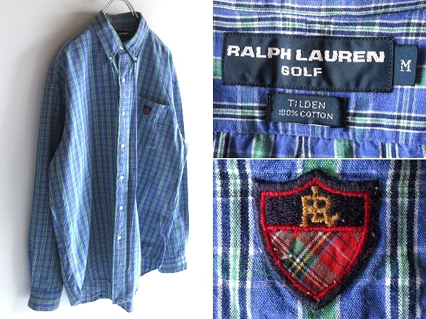 > 希少 90sビンテージ POLO GOLF RALPH LAUREN ポロゴルフ ラルフローレン TILDEN ロゴワッペン チェックシャツ BDシャツ M USA企画 ネコポス