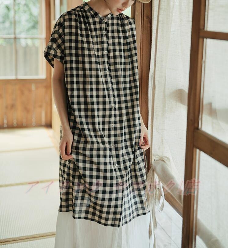 > ☆新品シャツワンピース ワンピース 半袖 カジュアル チェック柄 切り替え ロングワンピース 綿麻混風 涼しい ブラック