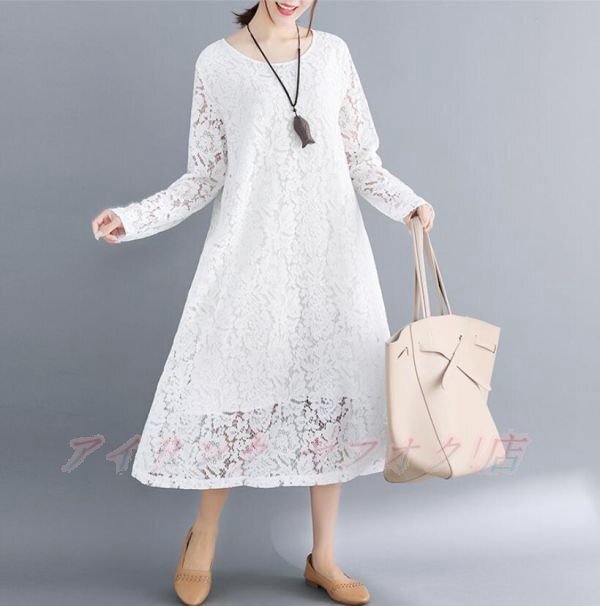 > ☆新品サイズ選択可 春夏 カジュアル ワンピース 上質 総レース コットン裏地 大きいサイズ 長袖 ロングワンピース 白