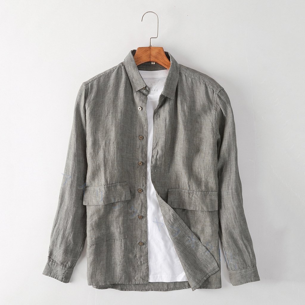 > ☆新品メンズシャツ ストライプ 長袖シャツ カジュアルシャツ 綿麻 シャツ 薄手 通気 おしゃれ 軍緑 S~2XL