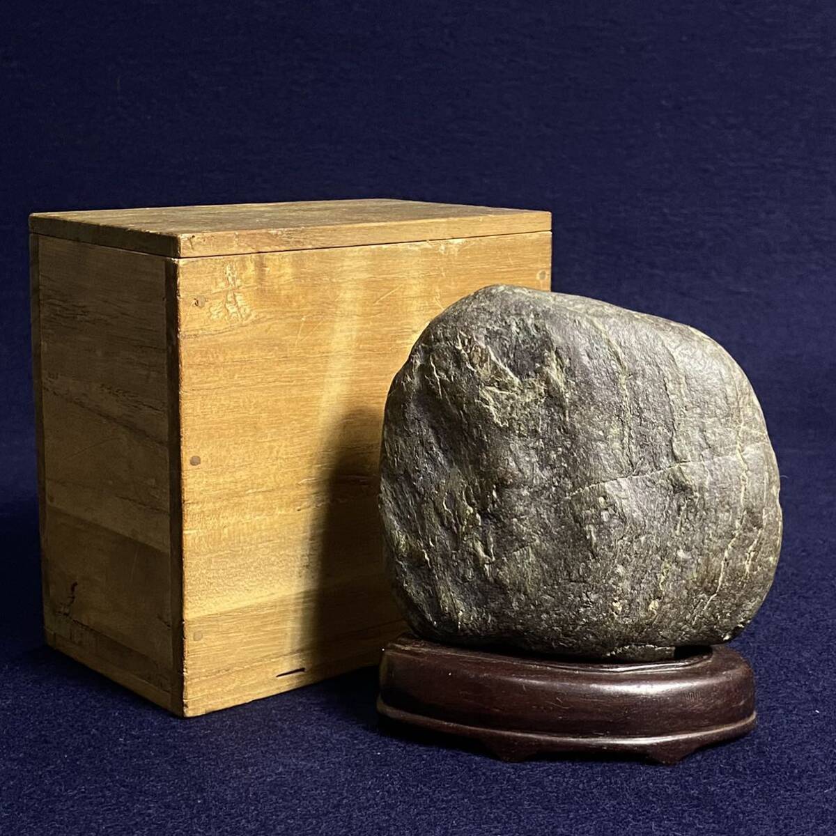 - T041【天然石 】鑑賞石 水石 盆石 原石 台座付 648.5g 詳細不明 木箱付