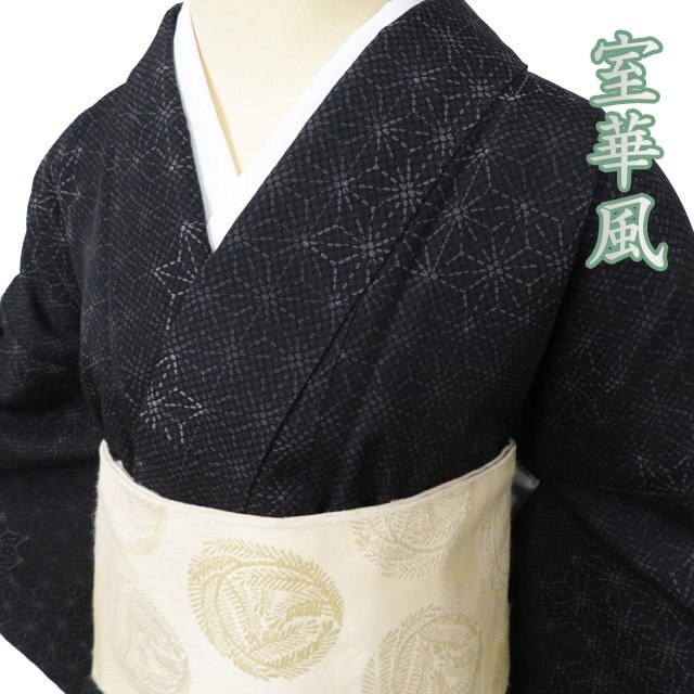 > 小紋 着物 中古 正絹 袷 カジュアル 室華風 麻の葉模様 焦茶色 黒色 多色 身丈158.5cm 裄68.5cm M ワイド きもの北條 A1105-4