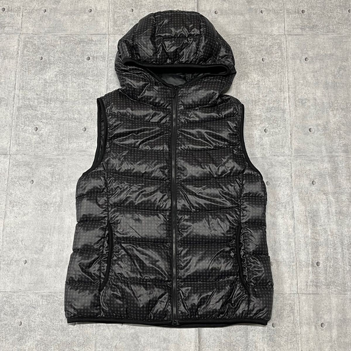 - 極美品 UNIQLO ライトダウンベストパーカー フーディー ドット柄 ユニクロ 水玉 シックなブラック×ブラック 撥水 防寒 保温 軽量 早4040