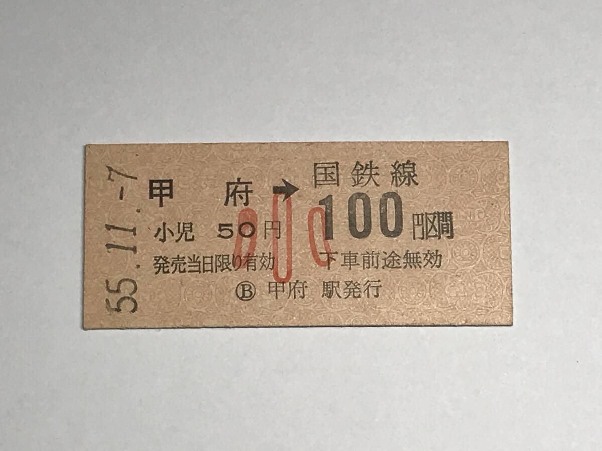 - 昔の切符 きっぷ 硬券 国鉄線 甲府駅発行 甲府→100円区間 小 サイズ:約2.5×5.8㎝ HF5104 くるり 岸田繁