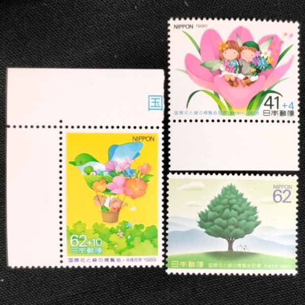 - [24110811]【国際花と緑の博覧会記念】単片3種完 寄付金付「花気球・花と妖精・樹」62(10)+41(+4)+62円 1989年 1990年発行 美品