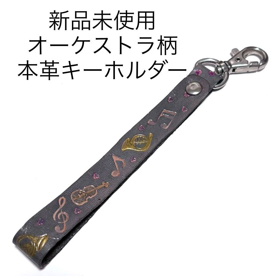 - 新品未使用 本革 レザークラフト刻印チャームキーホルダー オーケストラ柄 ブルー 青 音符 楽器 革小物 ストラップ