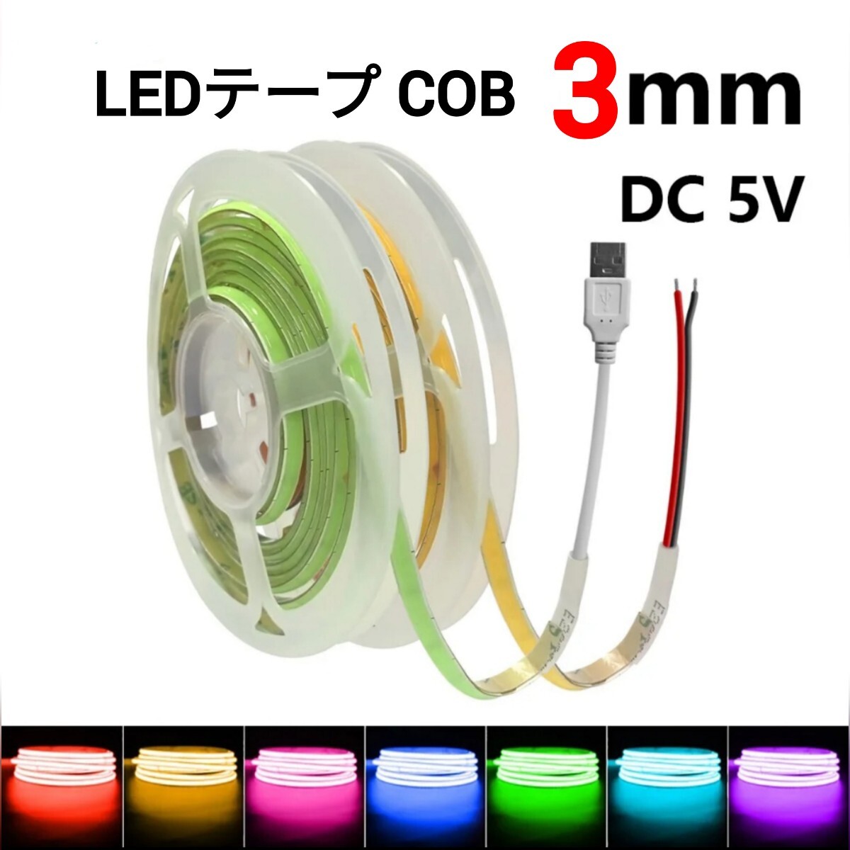 - LEDテープ COBタイプ 5m 5v USB、配線むき出し■白、ナチュラル白、電球色、青、ピンク、緑、赤、水色■C12