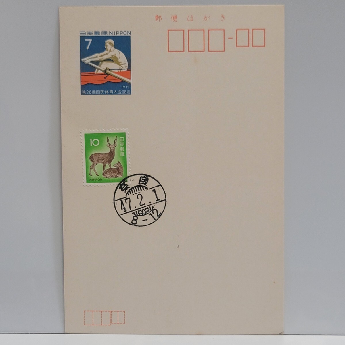 - [エンタイヤ] 切手 10円/鹿 初日ハト印 櫛型印 奈良 47.2.1 (1972年) ハガキ:第26回国民体育大会記念 コレクター放出品!