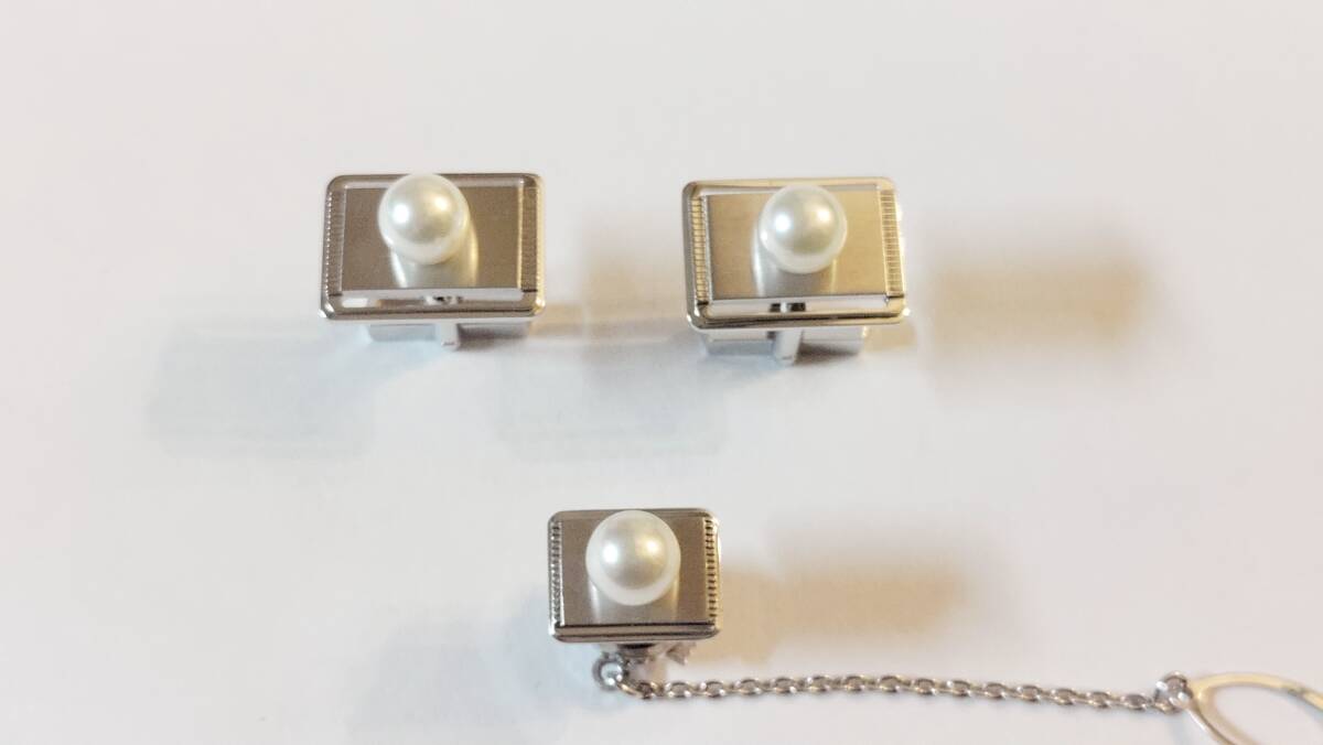 - 582 未使用 天然真珠付き タイピン カフスボタン セット silver 昭和レトロ