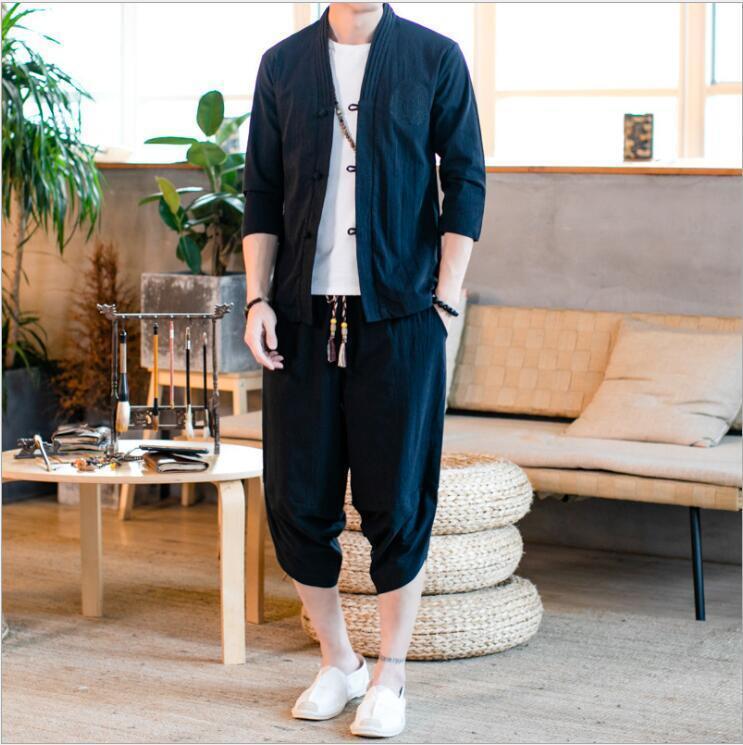 - メンズジャージ セットアップ 綿麻上下セット スウェット ルームウェア スポーツウエア 涼しい 七分袖 2点セットYWQ269