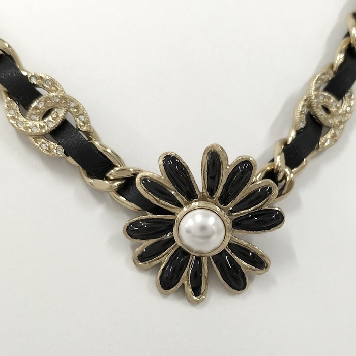 > CHANEL フラワー パール ネックレス ロング チェーン ココマーク レザー メッキ ゴールド系 A22K