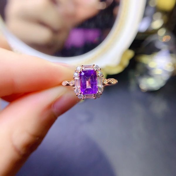- 【証明書付き】女性用スターリングシルバーアメジストリング、5x7mm、サイズ調節可能、最初の入札者様は開始価格で購入可能