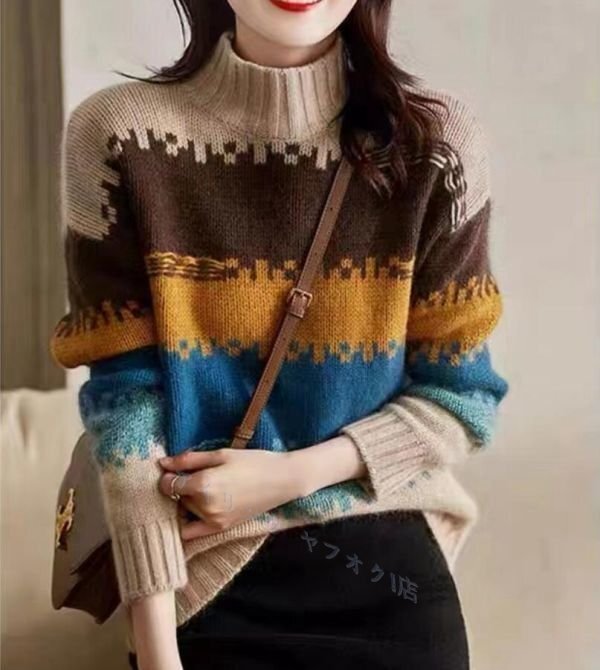 > ☆新品フリーサイズ 秋冬 オシャレ ゆったり 配色柄 ミンクカシミヤ混 柔らかい 暖かい ストレッチ ニットトップス ニットセーター