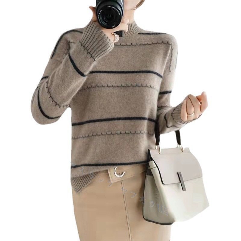 > ☆新品Fサイズ 秋冬 オシャレ 立ち襟 暖かい ニットセーター 純色 ふんわり袖 20304050代 着痩せ ニットトップス