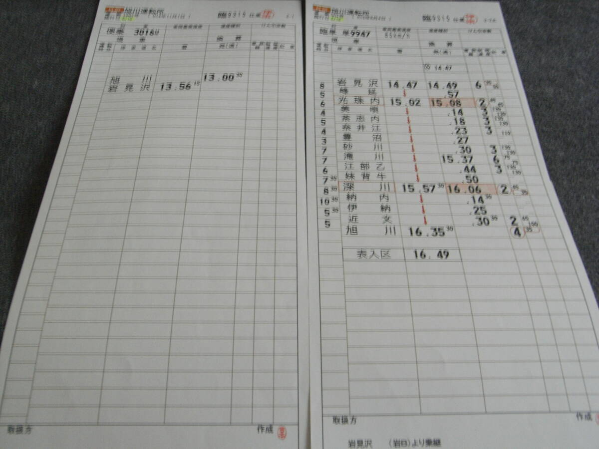 - 2枚/スタフ 函館本線 旭川運転所 臨9315仕業 臨単 単9947 岩見沢-旭川/便乗3016M 旭川-岩見沢 施行日 平成15年6月16日●運転士時刻表