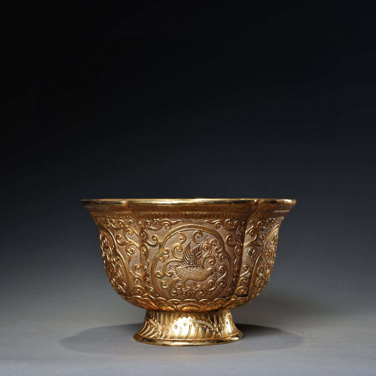 - 『清・銅製細作・塗金・浮彫・神獣紋・花瓣碗 』極細工 置物 古賞物 中国古玩 中国古美術
