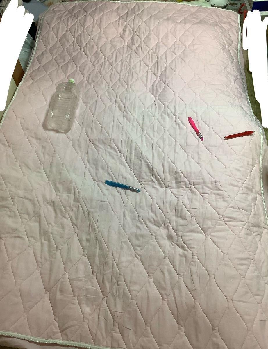 > 敷パッド カバー一体型 S幅117長188cm 500円超10%オマケ タグ無 表多分綿裏化繊 縁一部汚と表脱色有 薄桃色裏ベージュ縁銀ラメ 80