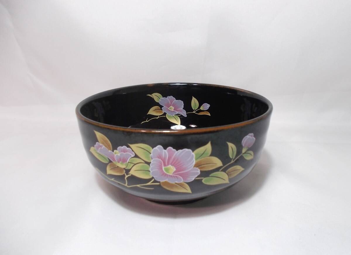 - きれいな漆黒の金彩花絵★丼/どんぶり(小-中)★浅型13cm★お碗/深鉢/中鉢★