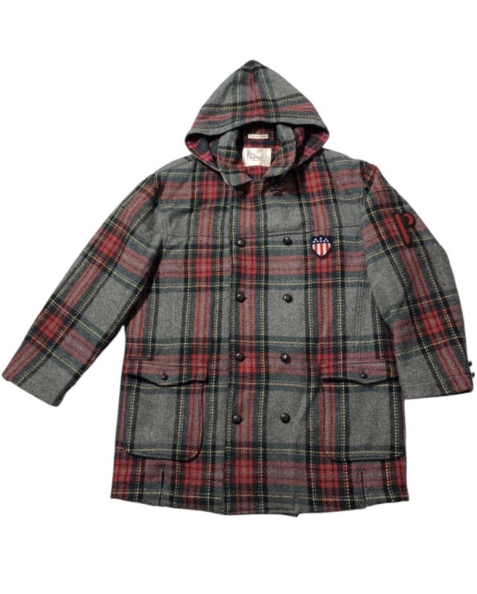 - ■ Papas パパス ■ Pロゴ エンブレム ワッペン チェック柄 着脱可能 フード付 ウール ダッフルコート グレー L