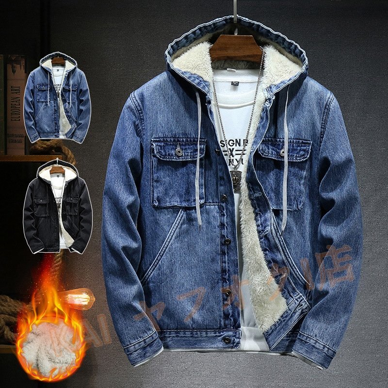 - 新品 メンズ デニムジャケット 裏ボア 厚手 裏フリース ブルゾン ジージャン バイクジャケット 秋冬 作業服 アウター パーカ ブルー 4XL