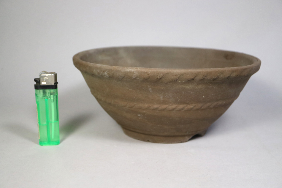 - b98) 時代 盆栽鉢 擂鉢形 丹波焼・約22.2×9.5cm 縄目文 丸鉢 明治大正時代 ●脚窯傷有<古丹波焼 古民芸 植木鉢 山野草鉢 蘭鉢