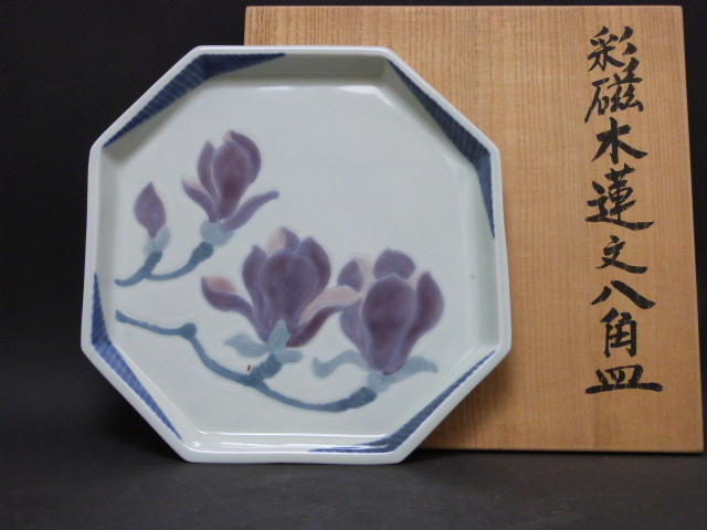 - ◇◆島田文雄◇◆彩磁木蓮文八角皿◇◆共箱あり◆◇
