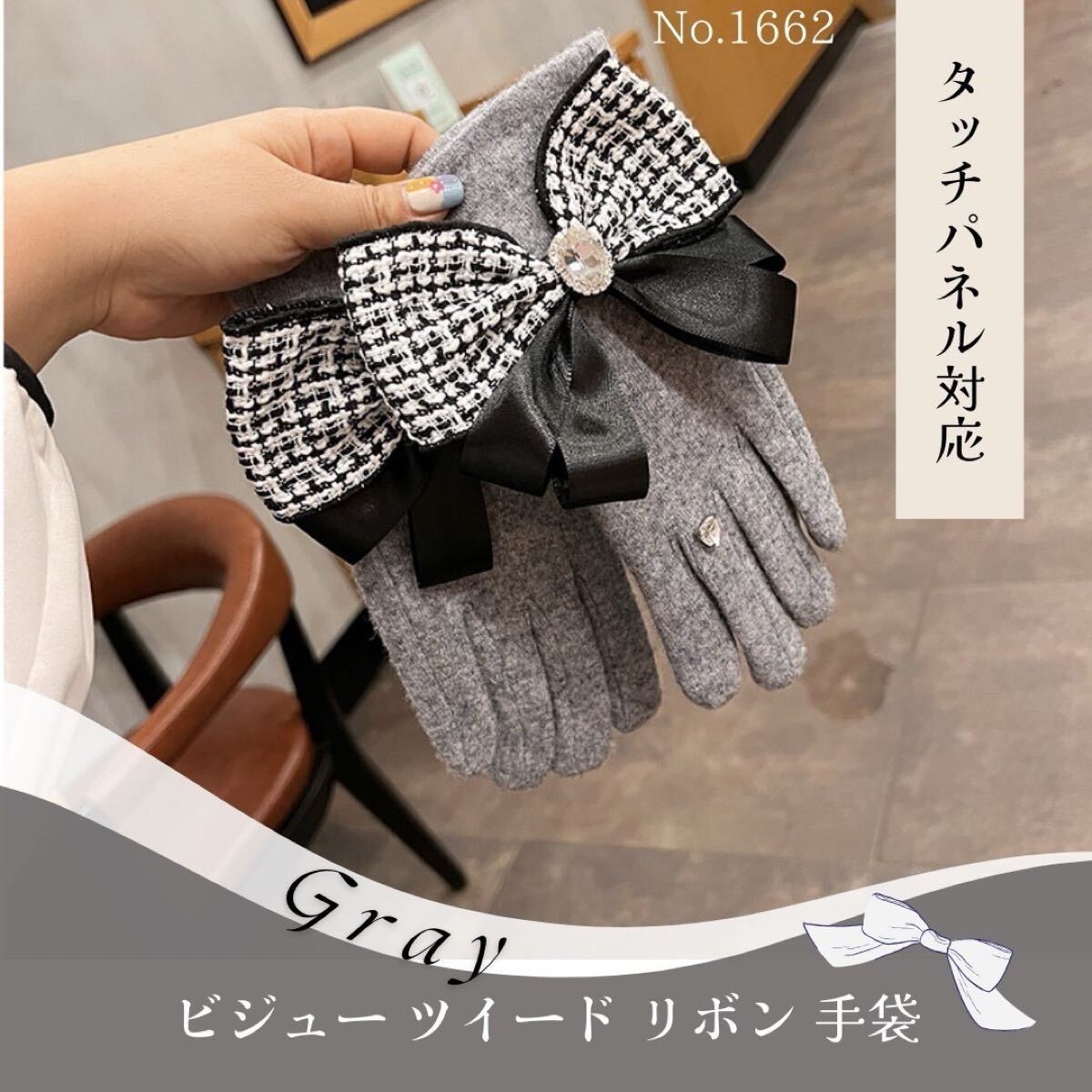 - ビジュー ツイード リボン 手袋 グレー レディース 通勤 通学 防寒対策 冬