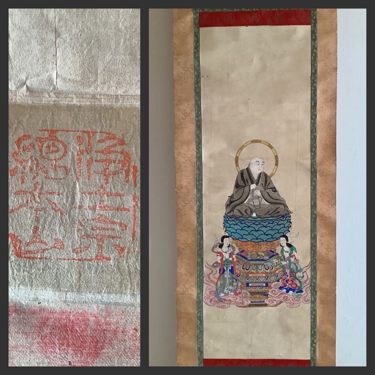 - 掛軸De614[法然上人尊像]彩色紙本版摺 木版画/仏画 仏教美術 浄土宗開祖 源空 浄土宗総本山裏印在 知恩院