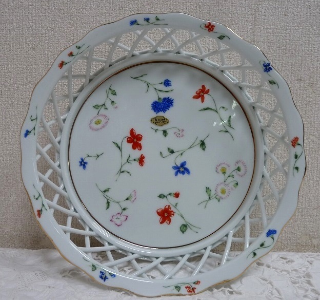 - (☆BM)有田焼/暢山 作 菓子器③陶器製 透かし細工 直径24.5㎝ 菓子鉢 色絵 染錦 花紋 籠 深皿 飾り皿 編み細工 バスケット 果物/小物入れ