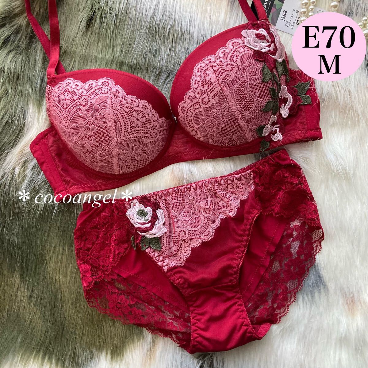 - 【E70-M レッド 上下セット】新品 ブラ&ショーツ ブラジャーショーツセット パッド付き バラモチーフ 薔薇 パンティ グラマー Eカップ