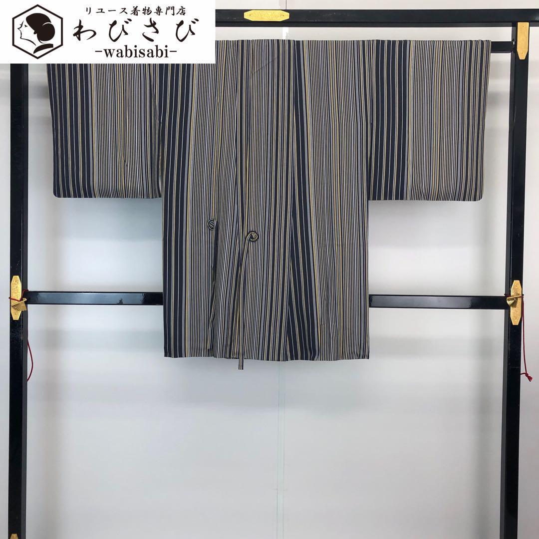 紺滅色のお色味の縮緬に縦縞模様の間道柄がデザインされた素敵なお品でござます。