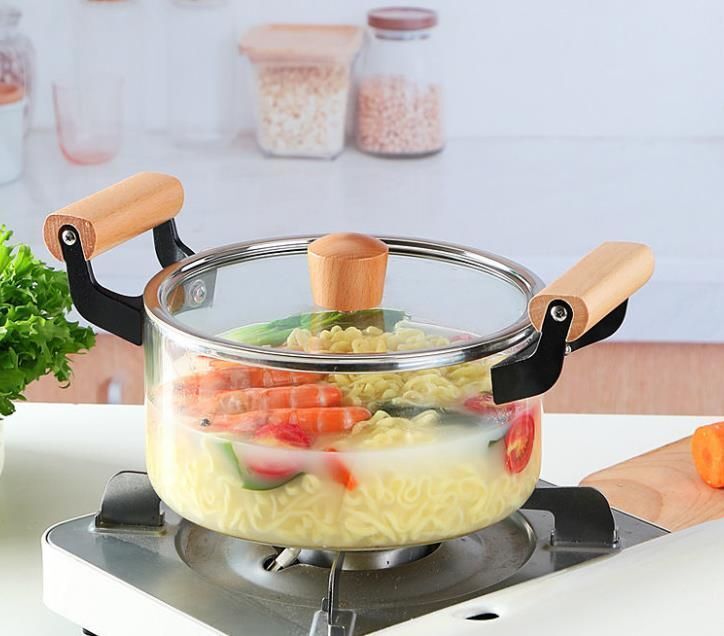 > パスタ鍋調理器具 加熱可能なクリアストックポット、ソースパン ガラス鍋、耐熱ガラス鍋 2.5L IH耐熱ガラス調理鍋 蓋と木製ハンドル付き