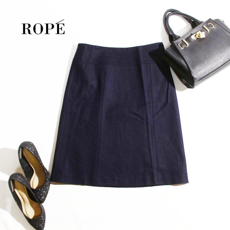 > 美品 ROPE’ ロペ 秋 冬 カシミヤ ウール混 Aライン フラノ ウールスカート 7号 36 ネイビー 紺 通勤 オフィス 綺麗め 無地 フランネル