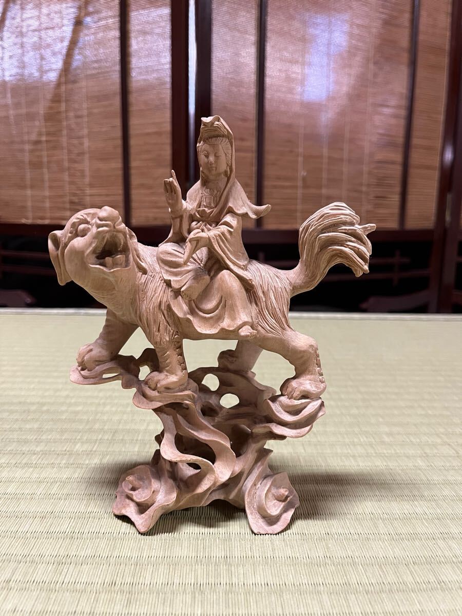 - 観音菩薩 仏像 犬 木彫 彫刻 天然木 細密 細工 仏教美術