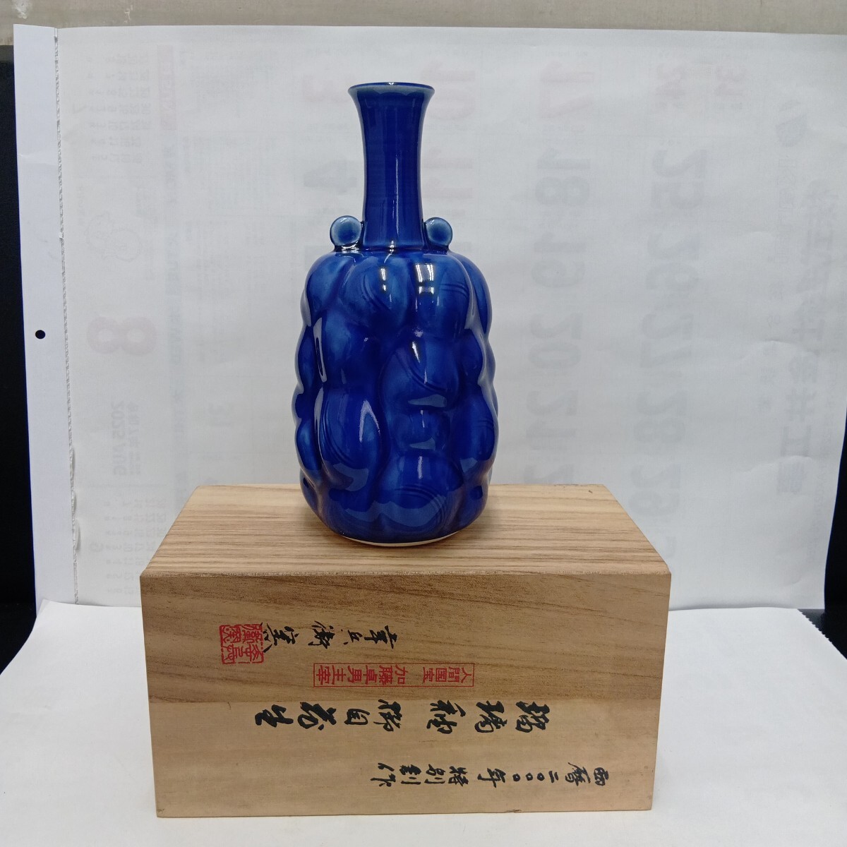 - 花器 人間国宝加藤卓男指導 瑠璃釉櫛目花生 幸兵衛窯 保管品 共箱付