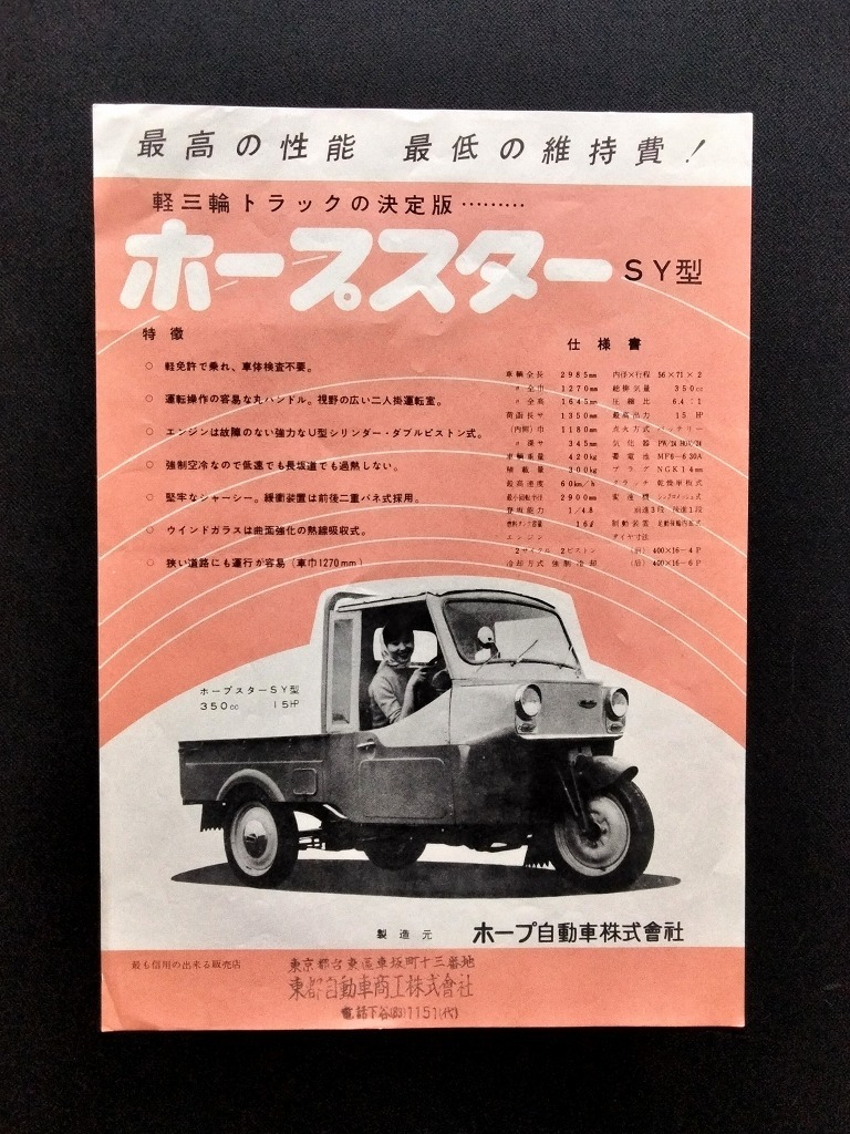 - ホープ自動車 軽三輪トラック ホープスター SY型 製品案内 広告 チラシ 昭和30年代 当時品 !! ☆ オート三輪 絶版メーカー 旧車カタログ