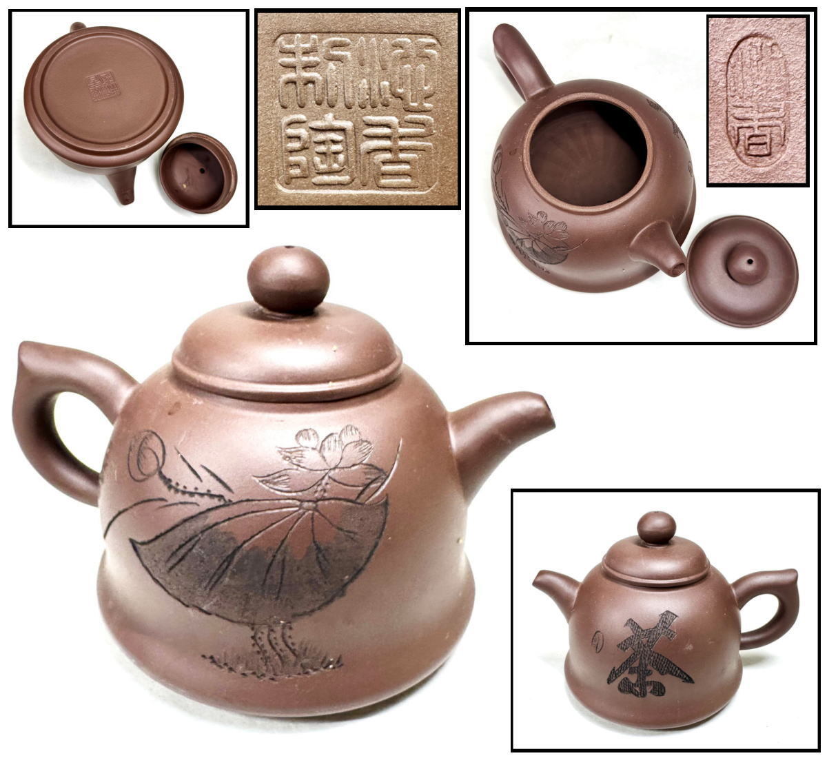 - 【送料無料】中国宜興 紫砂 刻蓮花茶壺 在銘刻印あり 唐物 美術 骨董品 煎茶道具 朱泥 急須 (旧家蔵出し) WWTT291