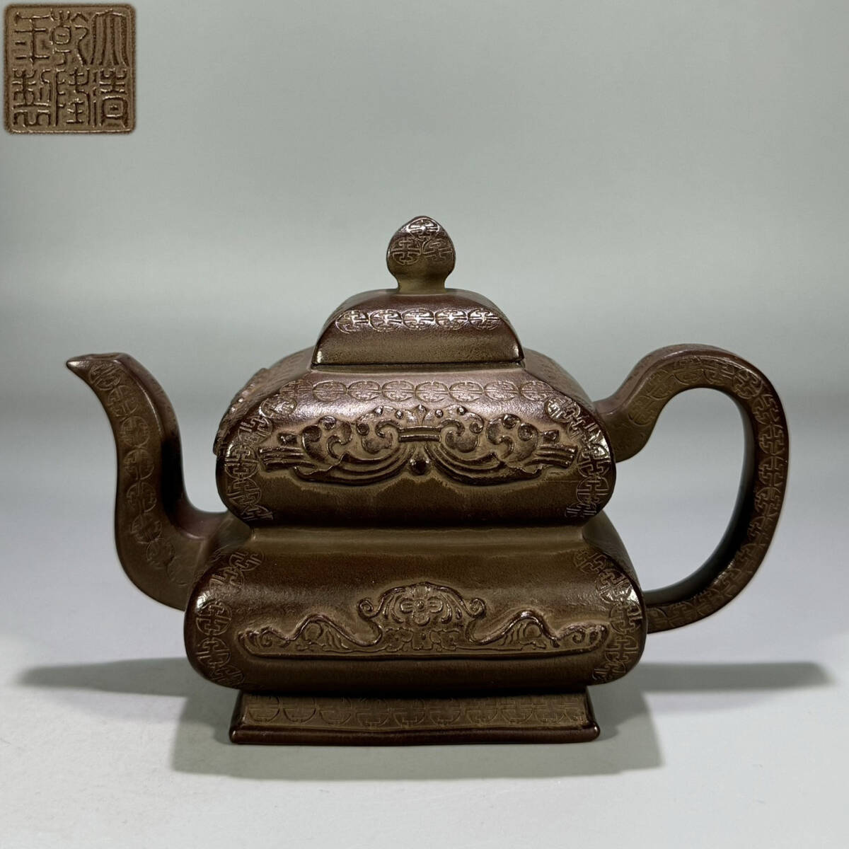 - 古陶芸 紫砂壷 清時代 【乾隆年製】 在銘 「四方節高瓢箪壺」 紫泥 煎茶 急須 茶道具 唐物 時代物 茶器 容量350cc LT-2412121