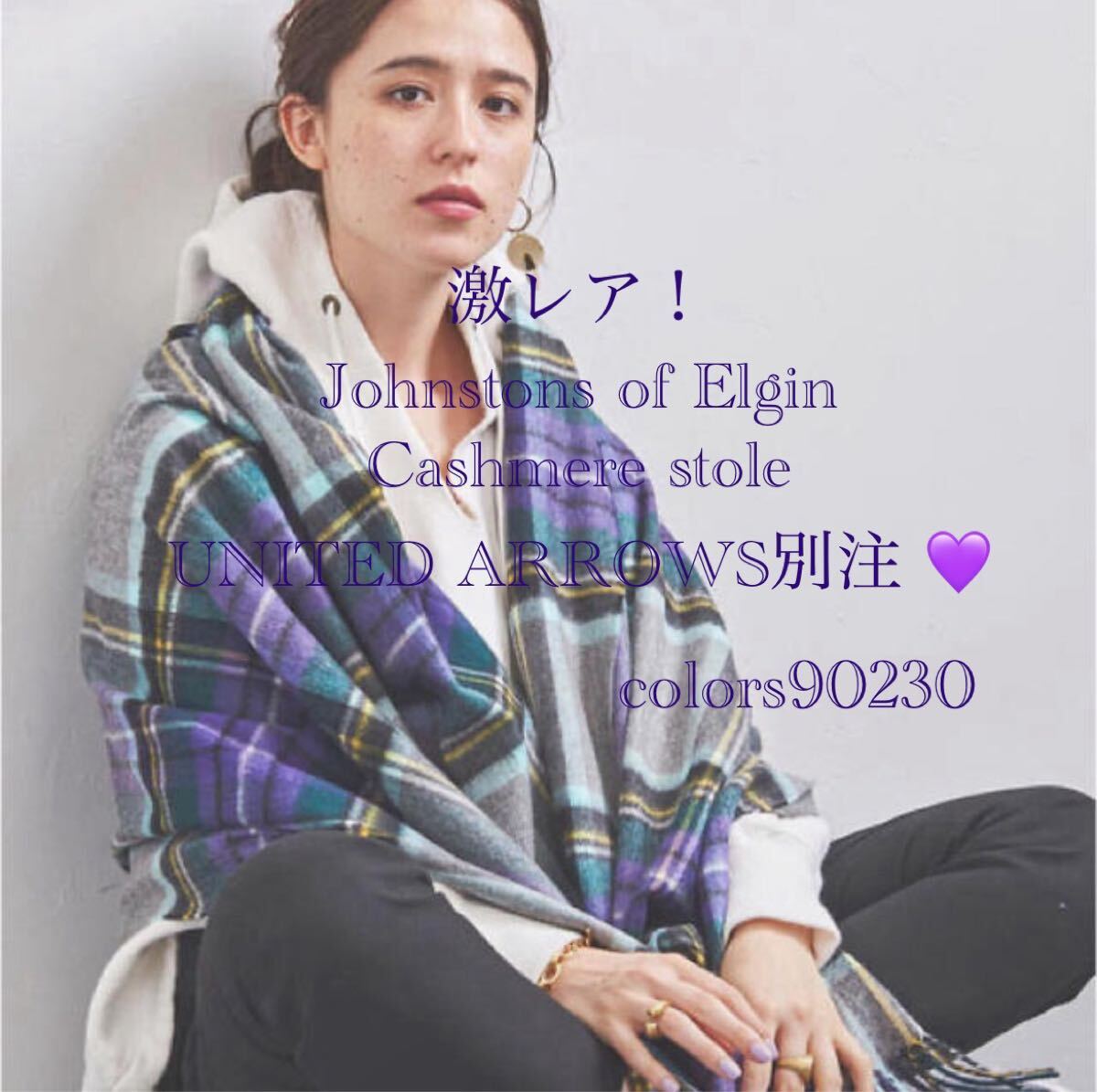> 激レア!UA別注☆未使用 ジョンストンズ カシミアストール グレー×パープル×ターコイズグリーン 大判マフラー ユナイテッドアローズ限定