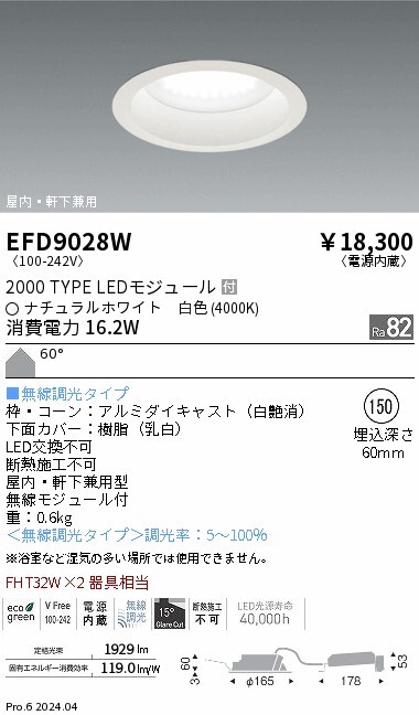 - 未使用 浅型ベースダウンライト 軒下用 Φ150 遠藤照明 EFD9028W A8564B08