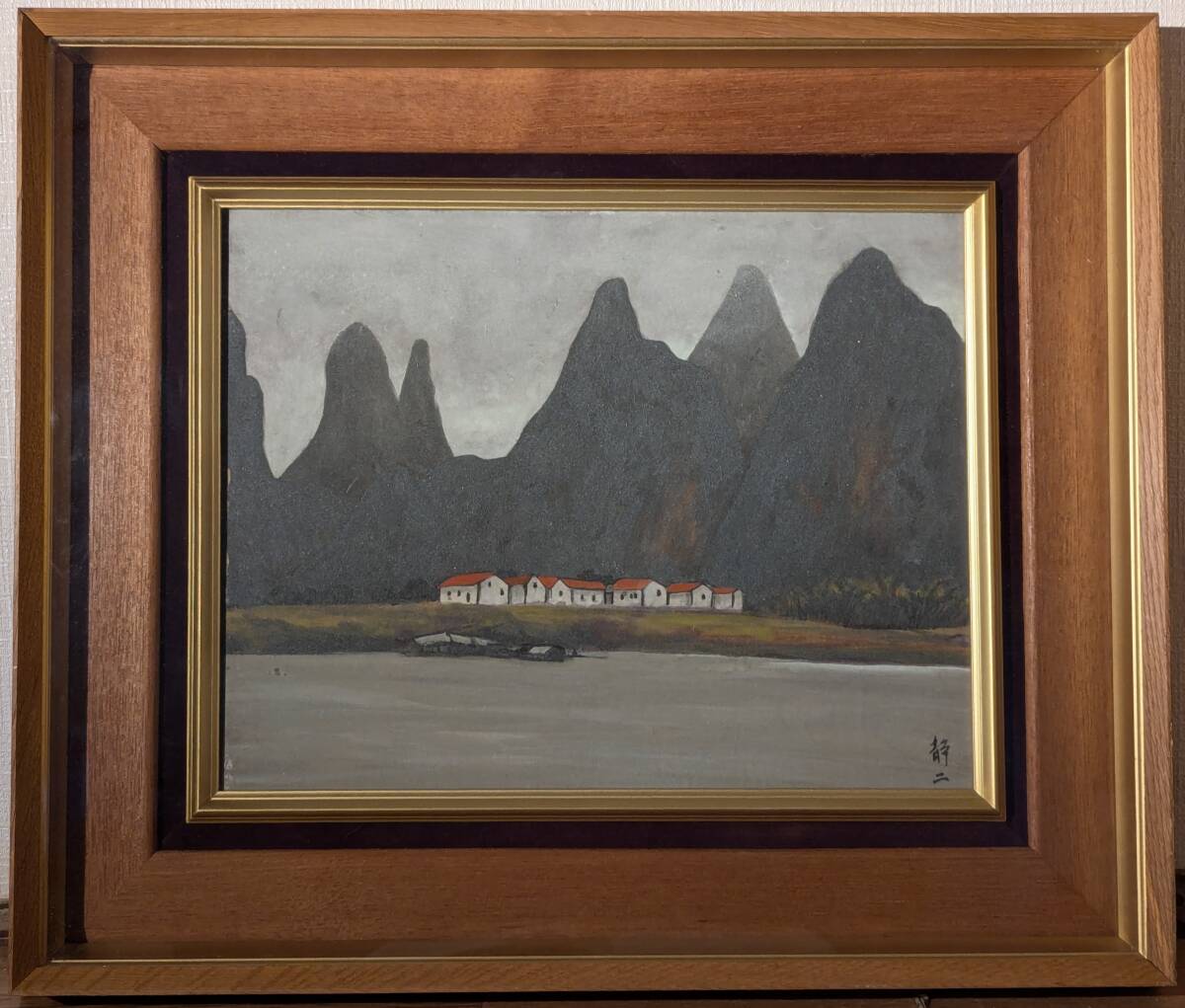 - 【真作】絵画 日本画 山水風景画 静寂の集落と山々の調和 自然美の表現 V18