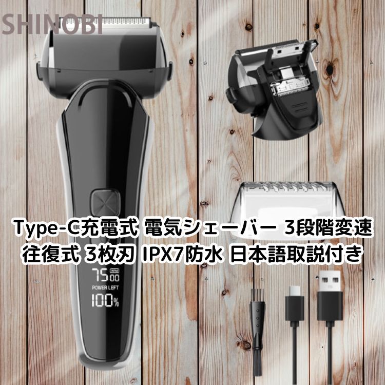 > Type-C充電式 電気シェーバー 3段階変速 往復式 3枚刃 IPX7防水でお風呂剃り可能 日本語取説付き 髭剃り ひげそり